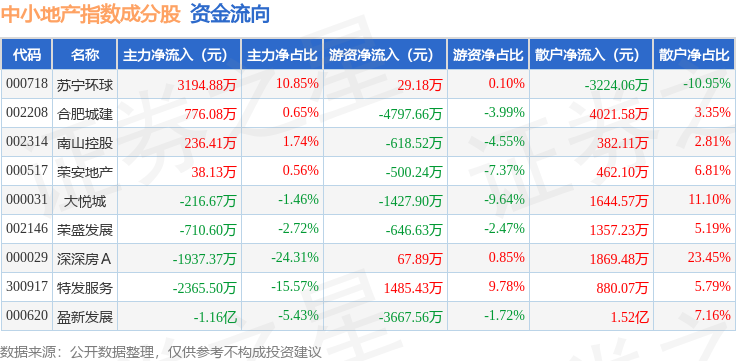 资金流向方面,中小地产(971002)指数成份股当日主力资金净流出合计1.25亿元,游资资金净流出合计1.01亿元,散户资金净流入合计2.26亿元。成份股资金流向详情见下表: