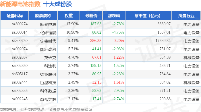 证券之星消息,11月12日,新能源电池(980027)指数报收于3455.89点,跌2.36%,成交609.35亿元,换手率2.58%。当日该指数成份股中,上涨的有8家,巨星科技以1.61%的涨幅领涨,下跌的有42家,锦浪科技以6.77%的跌幅领跌。