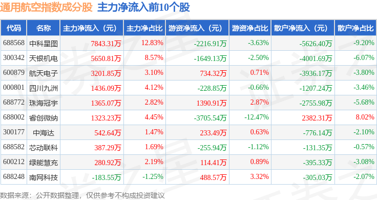 资金流向方面,通用航空(980076)指数成份股当日主力资金净流出合计17.77亿元,游资资金净流入合计4.57亿元,散户资金净流入合计13.2亿元。成份股资金流向详情见下表: