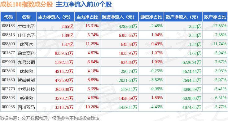 资金流向方面,成长100(980080)指数成份股当日主力资金净流出合计30.91亿元,游资资金净流出合计1.44亿元,散户资金净流入合计32.35亿元。成份股资金流向详情见下表: