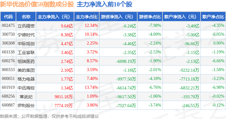 资金流向方面,新华优选价值50(989004)指数成份股当日主力资金净流出合计4.11亿元,游资资金净流出合计11.78亿元,散户资金净流入合计15.89亿元。成份股资金流向详情见下表: