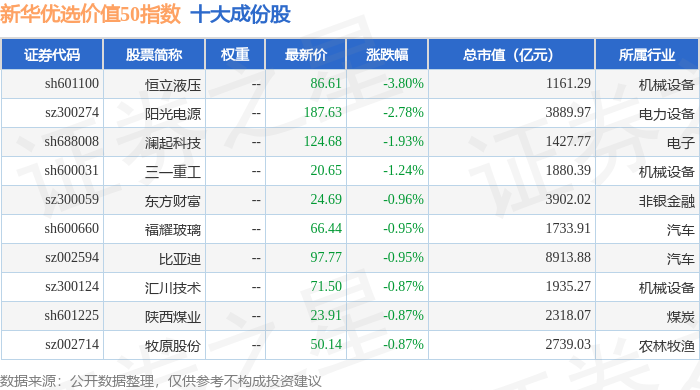 新华优选价值50(989004)指数十大成份股详情如下:
