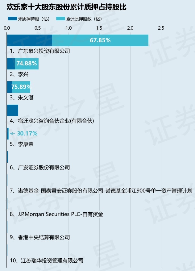 截止本公告日,股东广东豪兴投资有限公司已累计质押股份1.56亿股,占其持股总数的67.85%,股东李兴已累计质押股份3870.0万股,占其持股总数的74.88%,股东朱文湛已累计质押股份2893.0万股,占其持股总数的75.89%,股东李康荣已累计质押股份115.0万股,占其持股总数的30.17%。本次质押后欢乐家十大股东的累计质押股份占持股比例(占持股比例的计算以公司最新一期财务报表公布的十大股东的持股总数为基准)见下图: