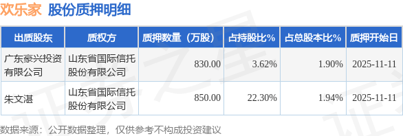 证券之星消息,欢乐家(300997)11月12日公开信息显示,股东广东豪兴投资有限公司、朱文湛向山东省国际信托股份有限公司合计质押1680.0万股,占总股本3.84%。质押详情见下表: