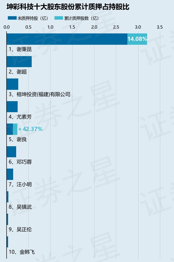 截止本公告日,股东谢秉昆已累计质押股份4515.6万股,占其持股总数的14.08%,股东谢良已累计质押股份1046.0万股,占其持股总数的42.37%。本次质押后坤彩科技十大股东的累计质押股份占持股比例(占持股比例的计算以公司最新一期财务报表公布的十大股东的持股总数为基准)见下图: