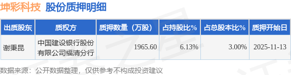 证券之星消息,坤彩科技(603826)11月12日公开信息显示,股东谢秉昆向中国建设银行股份有限公司福清分行合计质押1965.6万股,占总股本3.0%。质押详情见下表: