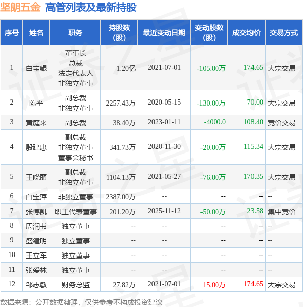 坚朗五金近半年内的董监高及核心技术人员增减持详情如下: