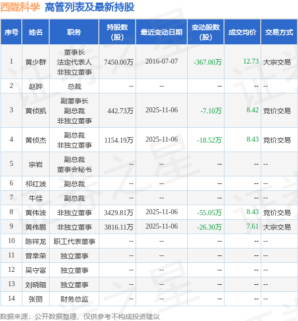 西陇科学近半年内的董监高及核心技术人员增减持详情如下: