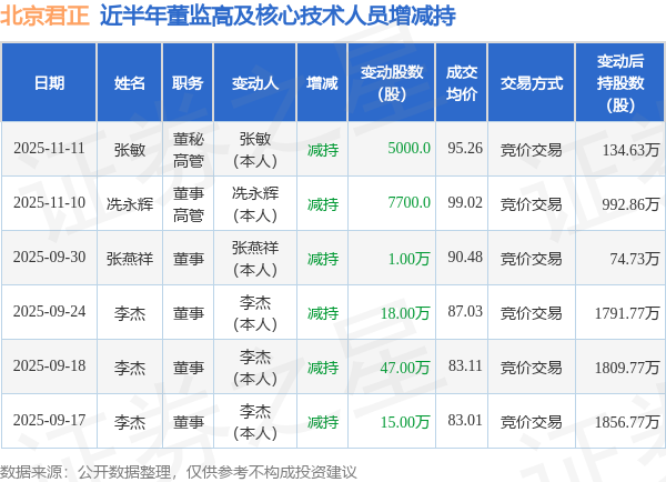 北京君正近半年内的董监高及核心技术人员增减持详情如下: