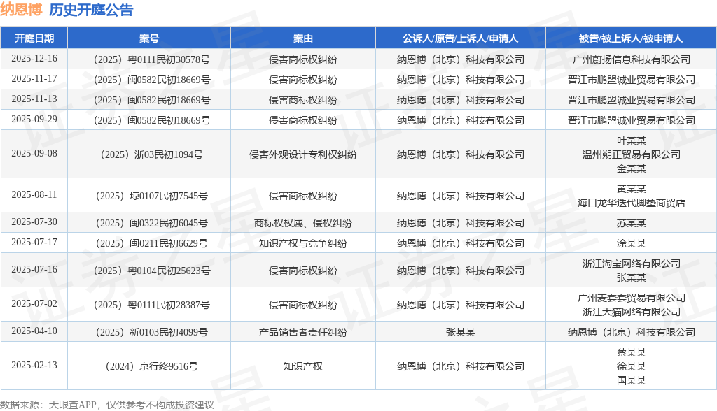 案号:(2025)闽0582民初18669号根据统计,近一年内以纳恩博(北京)科技有限公司为当事人的历史开庭公告有12则,其中案由为“侵害商标权纠纷”的公告以7则居首,其次为“产品销售者责任纠纷”有1则,“侵害外观设计专利权纠纷”有1则。历史开庭公告如下: