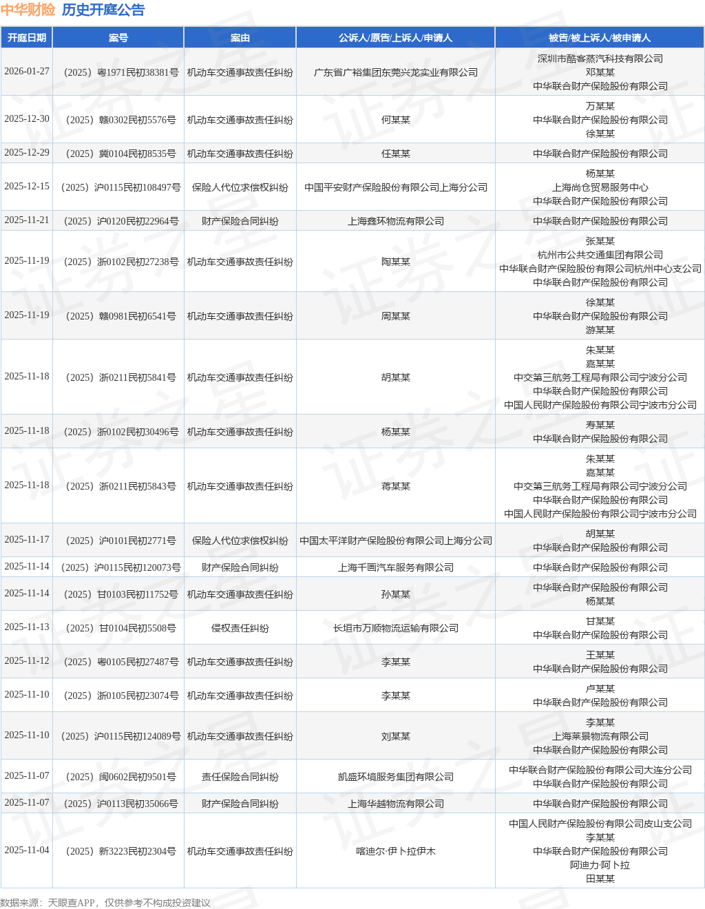 案号:(2025)甘0103民初11752号根据统计,近一年内以中华联合财产保险股份有限公司为当事人的历史开庭公告有699则,其中案由为“机动车交通事故责任纠纷”的公告以382则居首,其次为“财产保险合同纠纷”有58则,“保险人代位求偿权纠纷”有42则。历史开庭公告(前20条)如下: