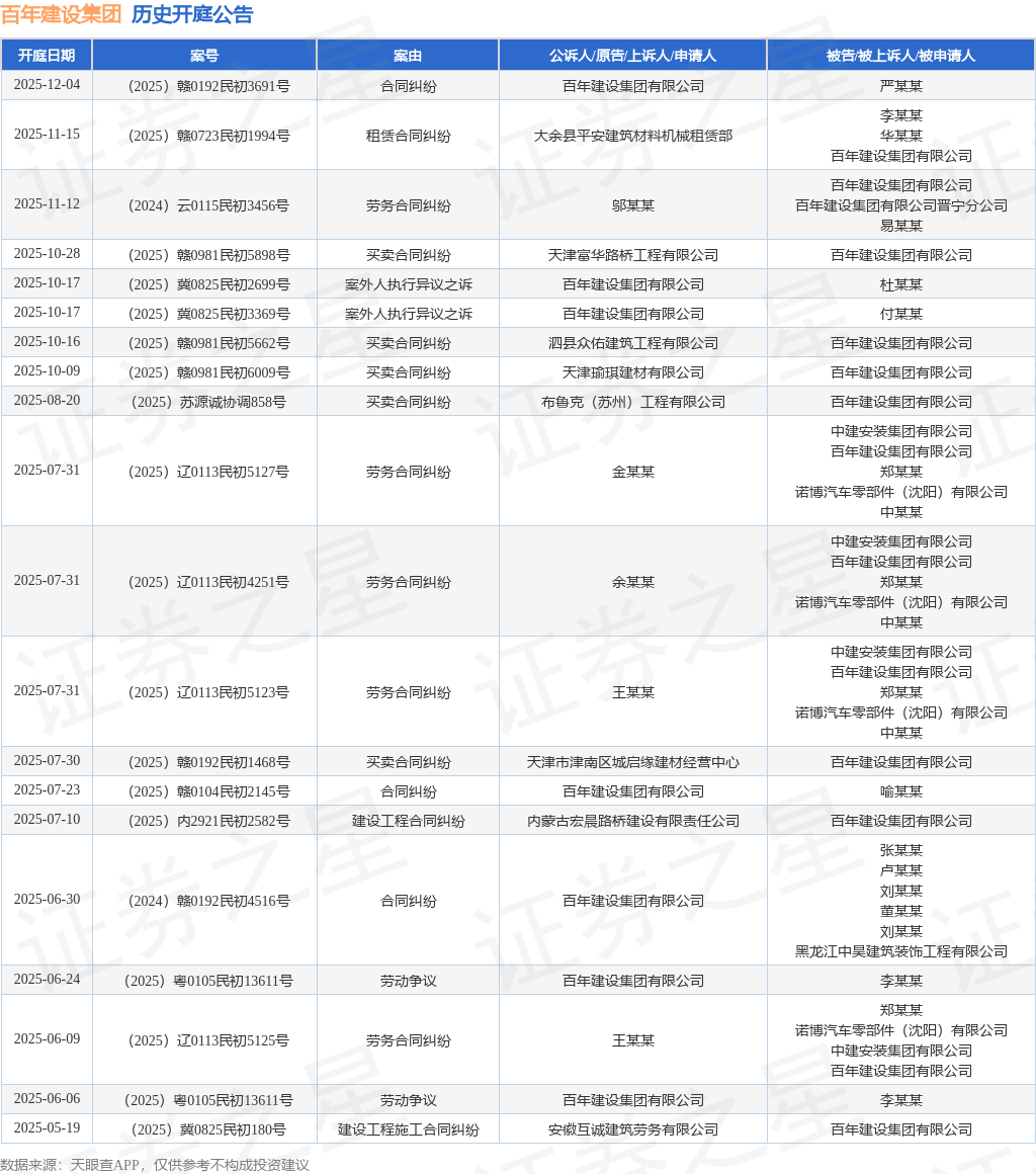 案号:(2025)赣0723民初1994号根据统计,近一年内以百年建设集团有限公司为当事人的历史开庭公告有38则,其中案由为“劳务合同纠纷”的公告以9则居首,其次为“买卖合同纠纷”有7则,“合同纠纷”有6则。历史开庭公告(前20条)如下: