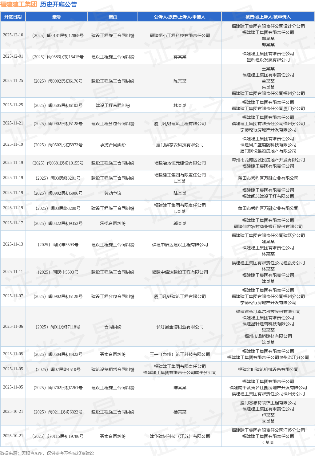 案号:(2025)闽民申5593号根据统计,近一年内以福建建工集团有限责任公司为当事人的历史开庭公告有140则,其中案由为“建设工程施工合同纠纷”的公告以56则居首,其次为“建设工程分包合同纠纷”有18则,“买卖合同纠纷”有11则。历史开庭公告(前20条)如下: