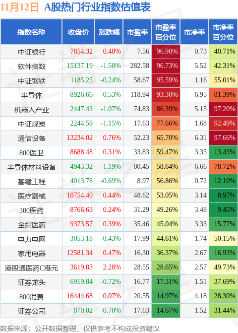 热门行业指数方面,中证银行的市盈率百分位较高,为96.9%。而证券公司的市盈率百分位较低,为14.67%。