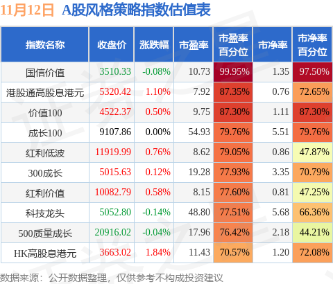 风格策略指数方面,国信价值的市盈率百分位较高,为99.95%。而HK高股息港元的市盈率百分位较低,为70.57%。
