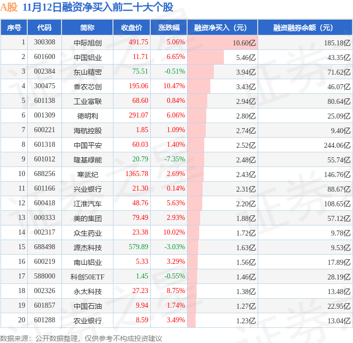 A股融资净买入前三分别为:中际旭创(300308)融资净买入10.6亿元、中国铝业(601600)融资净买入5.46亿元、东山精密(002384)融资净买入3.94亿元,前20具体见下表: