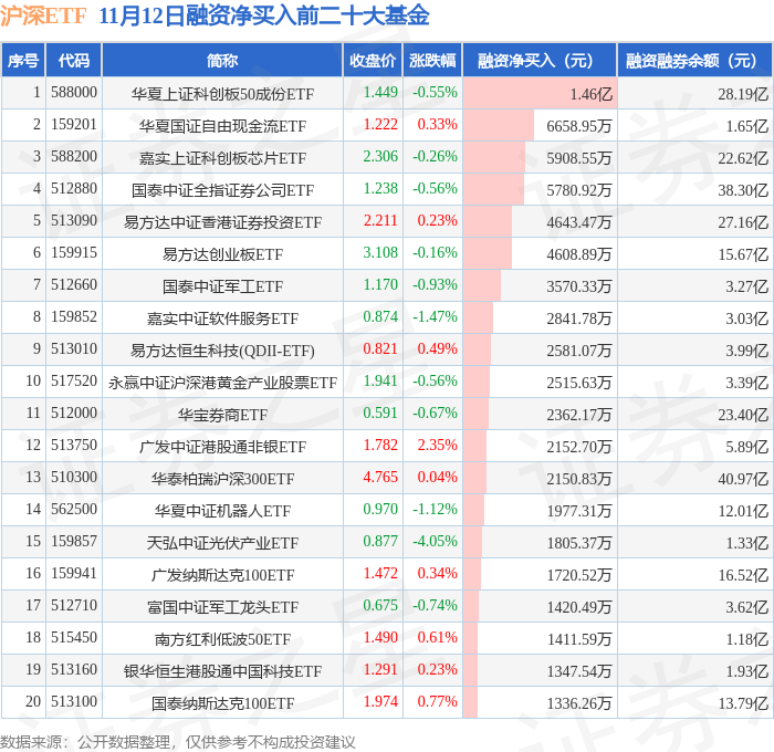 沪深ETF融资净买入前三分别为:华夏上证科创板50成份ETF(588000)融资净买入1.46亿元、华夏国证自由现金流ETF(159201)融资净买入6658.95万元、嘉实上证科创板芯片ETF(588200)融资净买入5908.55万元,前20具体见下表: