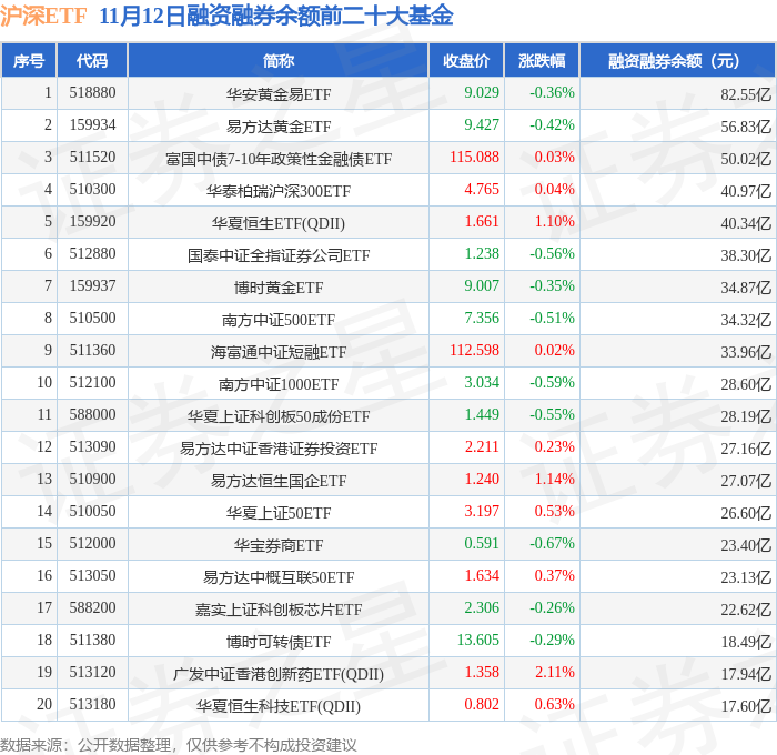 沪深ETF融资融券余额前三分别为:华安黄金易ETF(518880)融资融券余额82.55亿元、易方达黄金ETF(159934)融资融券余额56.83亿元、富国中债7-10年政策性金融债ETF(511520)融资融券余额50.02亿元,前20具体见下表: