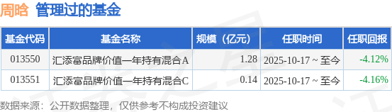 周晗先生:中国国籍,研究生学历、硕士学位。2020年7月加入汇添富基金管理股份有限公司。2025年08月14日至今任汇添富新兴消费股票的基金经理助理。2025年10月17日担任汇添富品牌价值一年持有期混合型证券投资基金基金经理。