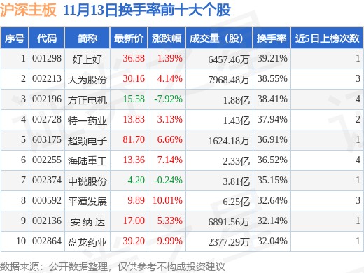 当日沪深主板换手率前10大个股中8只个股收涨,平均涨幅5.97%,其中好上好(001298)以换手率39.21%排第一,5只个股近5个交易日中多次上榜。