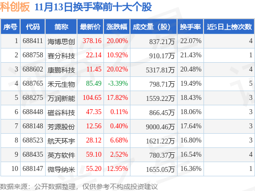 当日科创板换手率前10大个股中9只个股收涨,平均涨幅10.16%,其中海博思创(688411)以换手率22.07%排第一,8只个股近5个交易日中多次上榜。