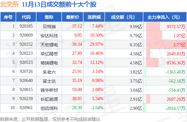 当日北交所成交额前10大个股中9只个股收涨,平均涨幅9.11%,其中贝特瑞(920185)以成交额9.99亿元排第一。从主力资金流入看,成交额前10大个股中有6只个股呈现主力资金净流入。