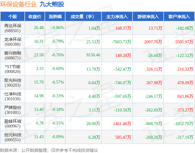 个股表现方面,环保设备行业当日领跌股为青达环保(688501),该股当日报收26.48,下跌0.86%,成交量1.04万,主力资金净流入168.37万元。龙净环保(600388)以下跌0.79%紧随其后,该股当日成交量25.53万,主力资金净流出7603.73万元。除此之外,碧兴物联(688671)、*ST节能(000820)、聚光科技(300203)均进入当日熊股之列。具体个股列表见下表: