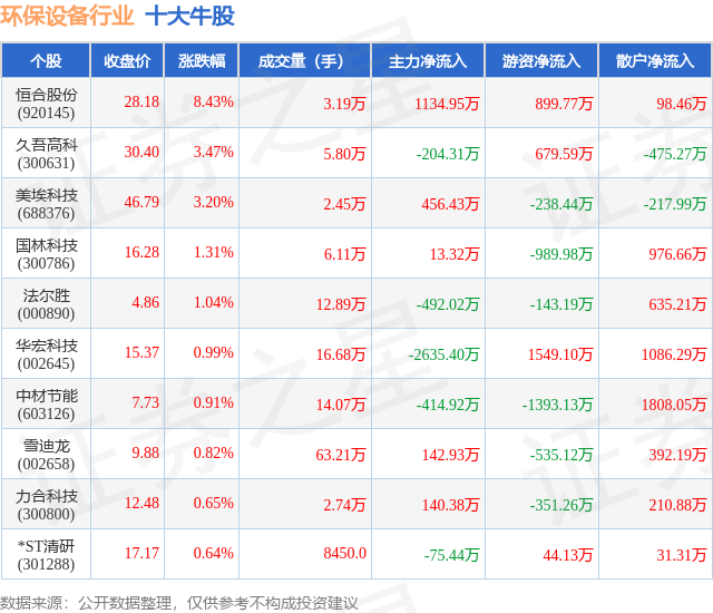 个股表现方面,环保设备行业当日领涨股为恒合股份(920145),该股当日报收28.18,上涨8.43%,成交量3.19万,主力资金净流入1134.95万元。久吾高科(300631)以上涨3.47%紧随其后,该股当日成交量5.8万,主力资金净流出204.31万元。除此之外,美埃科技(688376)、国林科技(300786)、法尔胜(000890)均进入当日牛股之列。具体个股列表见下表: