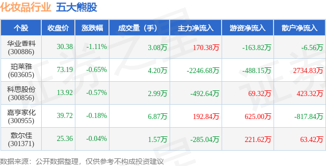 个股表现方面,化妆品行业当日领跌股为华业香料(300886),该股当日报收30.38,下跌1.11%,成交量3.08万,主力资金净流入170.38万元。珀莱雅(603605)以下跌0.65%紧随其后,该股当日成交量4.2万,主力资金净流出2246.68万元。除此之外,科思股份(300856)、嘉亨家化(300955)、敷尔佳(301371)均进入当日熊股之列。具体个股列表见下表: