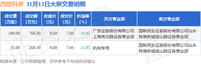 证券之星消息,11月13日西陇科学发生大宗交易,交易数据如下:
