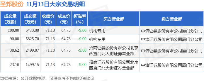 证券之星消息,11月13日圣邦股份发生大宗交易,交易数据如下: