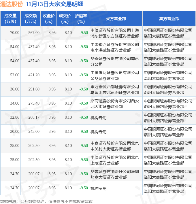 证券之星消息,11月13日通达股份发生大宗交易,交易数据如下: