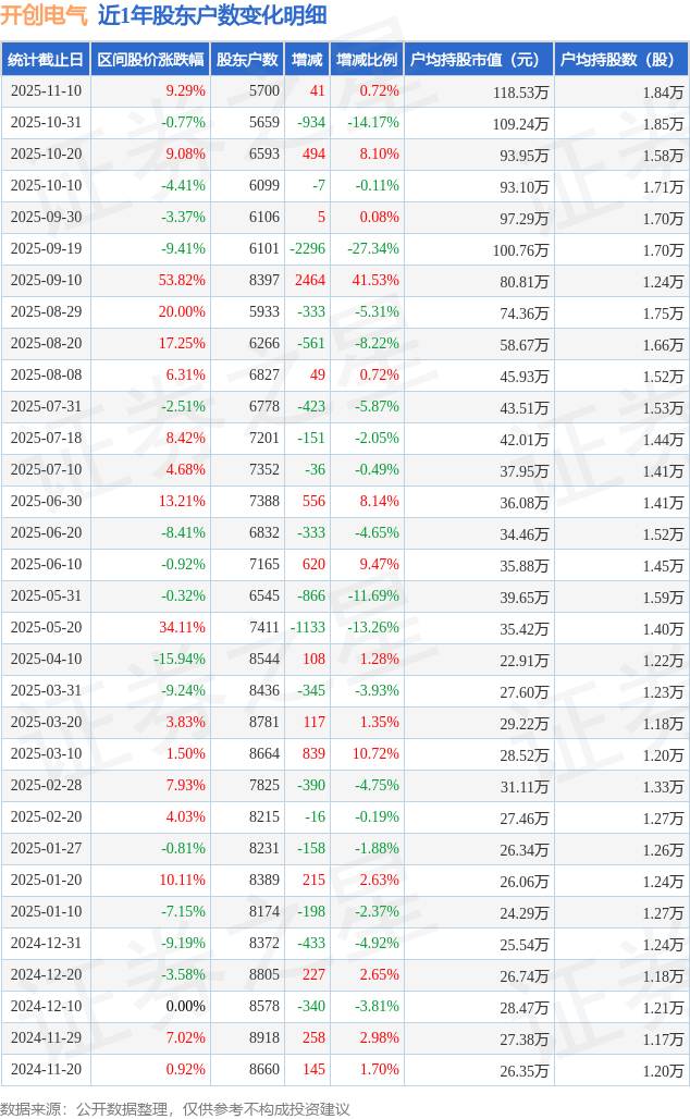 从股价来看,2025年10月31日至2025年11月10日,开创电气区间涨幅为9.29%,在此期间股东户数增加41.0户,增幅为0.72%。