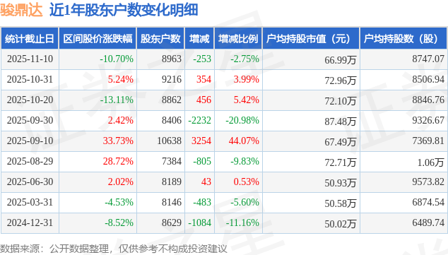 从股价来看,2025年10月31日至2025年11月10日,骏鼎达区间跌幅为10.7%,在此期间股东户数减少253.0户,减幅为2.75%。