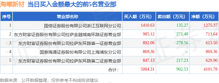 证券之星消息,沪深交易所2025年11月13日公布的交易公开信息显示,海螺新材(000619)因日振幅值达到15%的前5只证券登上龙虎榜。此次是近5个交易日内第2次上榜。