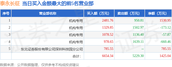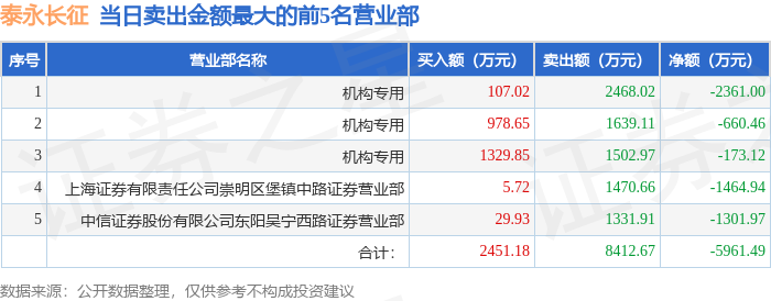 证券之星消息,沪深交易所2025年11月13日公布的交易公开信息显示,泰永长征(002927)因日跌幅偏离值达到7%的前5只证券登上龙虎榜。此次是近5个交易日内第1次上榜。