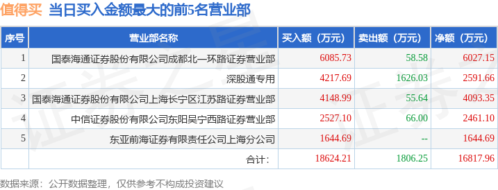 从龙虎榜公布的当日买卖数据来看,北向资金合计净买入2591.66万元。章盟主等知名游资榜上有名。(知名游资章盟主一般指国泰海通证券股份有限公司上海长宁区江苏路证券营业部席位,根据市场资料整理,仅供参考)