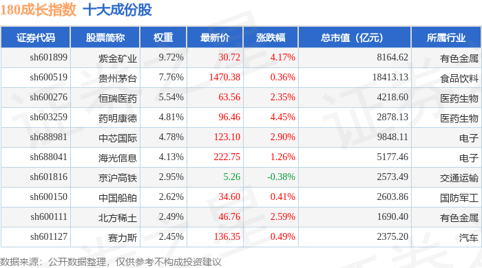 证券之星消息,11月13日,180成长(000028)指数报收于3936.05点,涨1.66%,成交1149.84亿元,换手率1.04%。当日该指数成份股中,上涨的有42家,华友钴业以8.04%的涨幅领涨,下跌的有17家,东鹏饮料以2.35%的跌幅领跌。