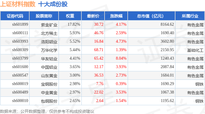 证券之星消息,11月13日,上证材料(000033)指数报收于3464.51点,涨2.97%,成交860.38亿元,换手率2.39%。当日该指数成份股中,上涨的有47家,华友钴业以8.04%的涨幅领涨,下跌的有3家,凯赛生物以0.64%的跌幅领跌。