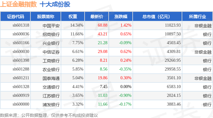 证券之星消息,11月13日,上证金融(000038)指数报收于5910.09点,涨0.37%,成交413.79亿元,换手率0.26%。当日该指数成份股中,上涨的有15家,华泰证券以2.42%的涨幅领涨,下跌的有13家,邮储银行以1.02%的跌幅领跌。