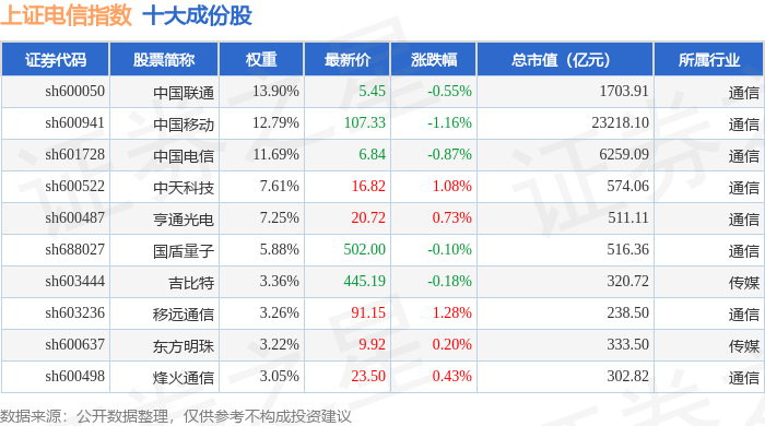 上证电信(000040)指数十大成份股详情如下: