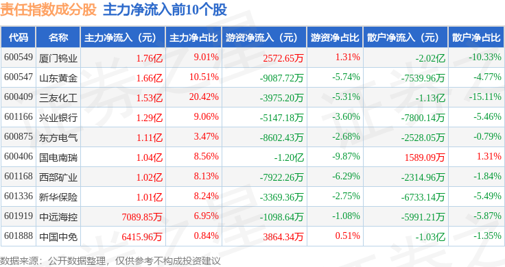 资金流向方面,责任指数(000048)成份股当日主力资金净流出合计4.76亿元,游资资金净流入合计5.48亿元,散户资金净流出合计7221.15万元。成份股资金流向详情见下表: