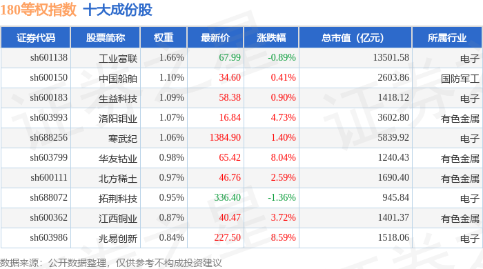证券之星消息,11月13日,180等权(000051)指数报收于9550.09点,涨0.96%,成交2817.12亿元,换手率0.52%。当日该指数成份股中,上涨的有119家,兆易创新以8.59%的涨幅领涨,下跌的有54家,国投电力以3.01%的跌幅领跌。