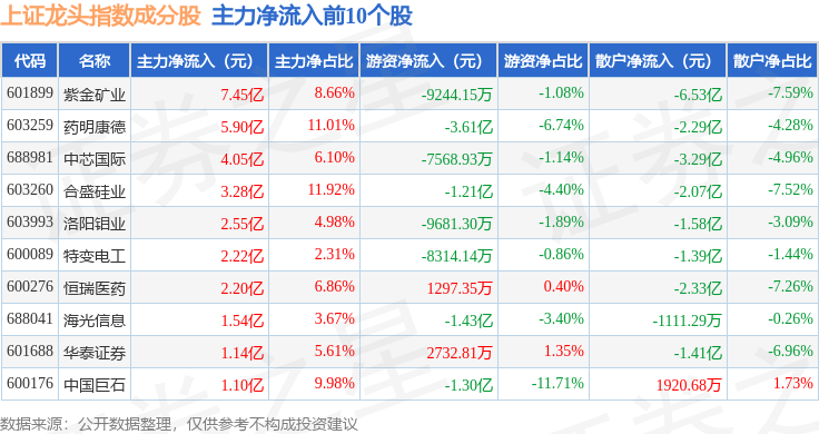 资金流向方面,上证龙头(000065)指数成份股当日主力资金净流入合计1.68亿元,游资资金净流入合计4.45亿元,散户资金净流出合计6.13亿元。成份股资金流向详情见下表: