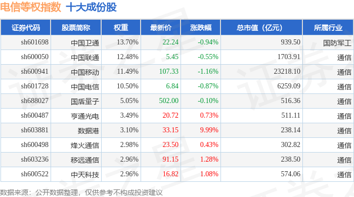 证券之星消息,11月13日,电信等权(000078)指数报收于3309.65点,涨0.05%,成交165.69亿元,换手率0.68%。当日该指数成份股中,上涨的有15家,数据港以9.99%的涨幅领涨,下跌的有13家,南方传媒以1.23%的跌幅领跌。