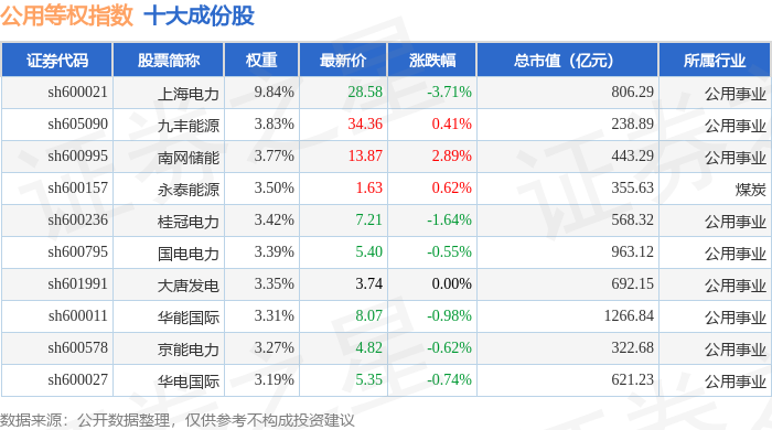 证券之星消息,11月13日,公用等权(000079)指数报收于2714.68点,跌0.62%,成交145.86亿元,换手率0.71%。当日该指数成份股中,上涨的有8家,南网储能以2.89%的涨幅领涨,下跌的有20家,上海电力以3.71%的跌幅领跌。
