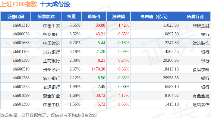 上证F200(000098)指数十大成份股详情如下: