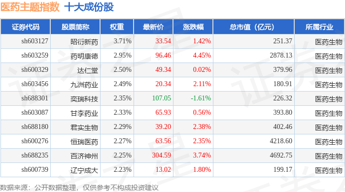 证券之星消息,11月13日,医药主题(000121)指数报收于8731.29点,涨0.58%,成交247.53亿元,换手率1.18%。当日该指数成份股中,上涨的有29家,泽璟制药以4.98%的涨幅领涨,下跌的有20家,大参林以2.89%的跌幅领跌。