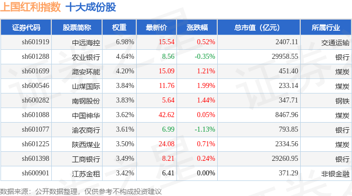 证券之星消息,11月13日,上国红利(000151)指数报收于1641.8点,涨0.26%,成交203.24亿元,换手率0.21%。当日该指数成份股中,上涨的有17家,山煤国际以1.99%的涨幅领涨,下跌的有10家,山东高速以1.99%的跌幅领跌。