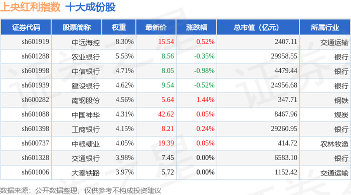 证券之星消息,11月13日,上央红利(000152)指数报收于3012.76点,涨0.11%,成交294.26亿元,换手率0.22%。当日该指数成份股中,上涨的有15家,新钢股份以2.35%的涨幅领涨,下跌的有12家,中国移动以1.16%的跌幅领跌。